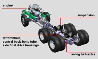 The TATRA chassis consists of a central "backbone" tube, extending along the whole length of the vehicle and covering all parts of the driveline, and of independent swing half-axles, coming out of the "backbone" tube and swinging up and down around the backbone tube center line. While each wheel copies the profile of the terrain, the rigid backbone tube actually eliminates any twist or bending of the chassis. In this way TATRA trucks can overcome various obstacles at higher speeds than vehicles of conventional design, offer exceptional mobility, as well as unusual comfort for the driver and load when operating off-road or cross-country.